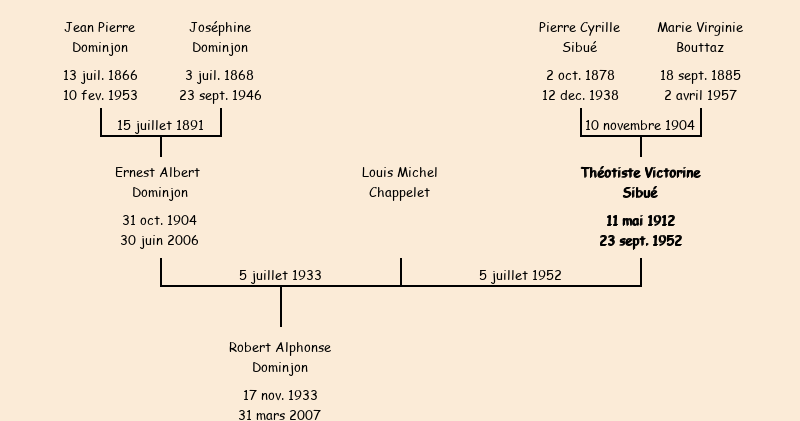 Epouse : Théotiste Victorine Sibué (21 ans, née à Fontcouverte le 11 mai1912, de La Bise), fille de Pierre Cyrille et de Marie Virginie Bouttaz |