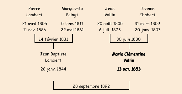 Témoins : Jean Marie Lambert fils de Jean Michel, 27 ans, Jean Baptiste Lambert fils de Jean Michel, 25 ans neveux de l'époux, Gabriel Vallin fils de Jean décédé, 51 ans frère de l'épouse et Jean Vallin fils de Gabriel, 22 ans neveux de l'épouse, tous cultivateurs |