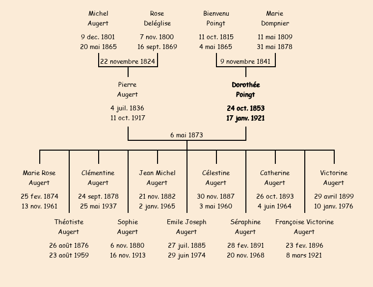 Epoux : Pierre Augert (36 ans, né le 4 juillet1836, cultivateur au Chef Lieu, veuf de Victorine Gilbert décédé le 4 décembre1870, a signé), fils de Michel (décédé le 20 mai1865) et de Rose Deléglise (décédée le 16 septembre1869) |