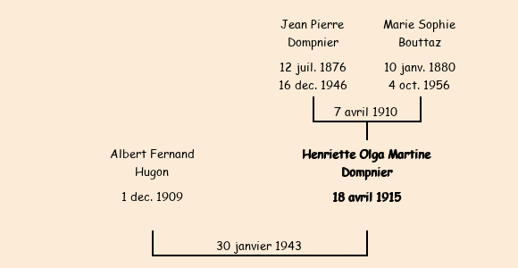 Epouse : Henriette Olga Martine Dompnier (27 ans, née à Fontcouverte le 18 avril1915, du Chef Lieu), fille de Jean Pierre et de Marie Sophie Bouttaz |