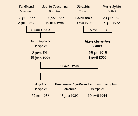 Epouse : Marie Clémentine Collet (19 ans, née à Fontcouverte le 25 juillet1915, de Planchamp), fille de Séraphin (dcédé) et de Marie Sylvie Collet |