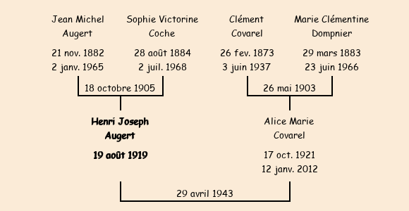Epoux : Henri Joseph Augert (23 ans, né à Fontcouverte le 19 août1919, domicilié au Chef Lieu), fils de Jean Michel et de Marie Sophie Coche |