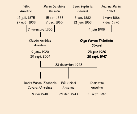 Epouse : Olga Yvonne Théotiste Covarel (22 ans, née à Fontcouverte le 23 juin1920, du Chef Lieu), fille de Jean Baptiste et de Jeanne Marie Collet |