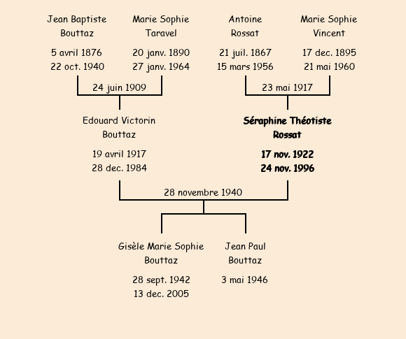Epouse : Séraphine Théotiste Rossat (18 ans, née à Fontcouverte le 17 novembre1922 , de La Curiaz), fille de Antoine et de Marie Sophie Vincent |