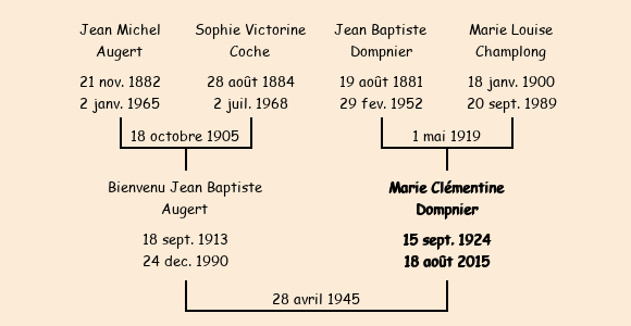 Mariée (20 ans) avec Bienvenu Jean Baptiste Augert (31 ans) le 28 avril 1945 à Fontcouverte |