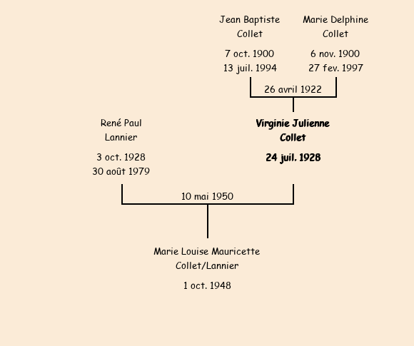 Epouse : Virginie Julienne Collet (21 ans, née à Fontcouverte le 24 juillet1928, du Chef Lieu), fille de Jean Baptiste et de Marie Delphine Collet |