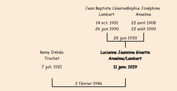 Epoux : Remy Irénée Truchet (24 ans, né à Saint Jean de Maurienne le 7 juillet1921, domicilié à La Combre quartier de Saint Jean de Maurienne), fils de Emile Gustave (employé aux Plâtrières du Sud Est) et de Francisca Cornu (domiciliés à Saint Jean de Maurienne) |
