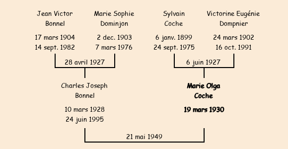 Epoux : Charles Joseph Bonnel (21 ans, né à Fontcouverte le 10 mars1928, domicilié aux Anselmes), fils de Jean Victor et de Marie Sophie Dominjon |