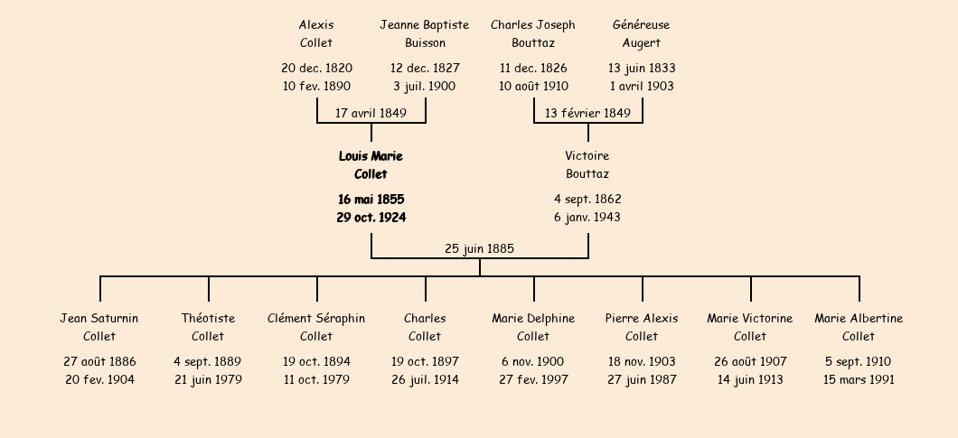 Epoux : Louis Marie Collet (30 ans, né le 16 mai1855, cultivateur à la Rochette, a signé), fils de Alexis (cultivateur, a signé) et de Jeanne Baptiste Buisson (cultivatrice, n'a pas su signer) |