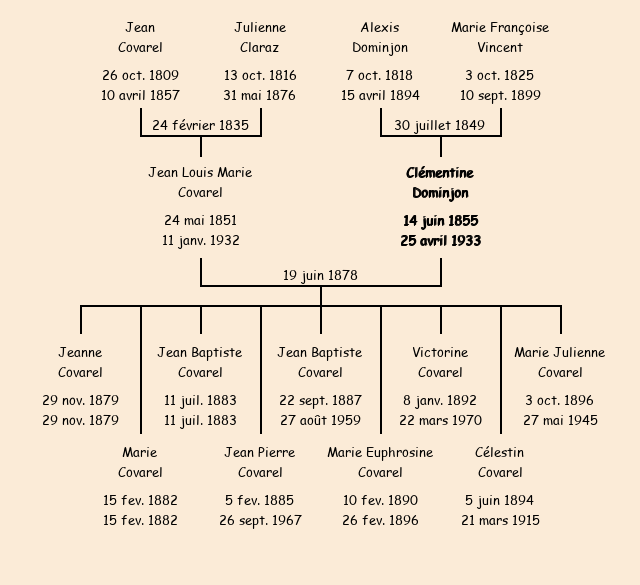 Témoins : Jean Baptiste Covarel fils de Jean décédé, 40 ans, Pierre Covarel fils de Jean décédé, 36 ans, tous deux cultivateurs et frères de l'époux, Alexis Claraz fils de Jean Pierre décédé, 55 ans cultivateur oncle de l'époux, Pierre Dominjon fils d'Antoine, 60 ans cultivateur oncle de l'épouse |