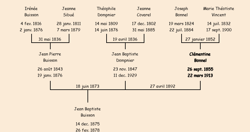 Epouse : Clémentine Bonnel (17 ans, née le 26 septembre1855, des Anselmes, cultivatrice, a signé), fille de Joseph (cultivateur, a signé) et de Marie Théotiste Vincent (cultivatrice, n'a pas su signer) |
