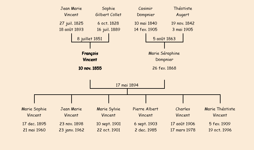 Epoux : François Vincent (38 ans, né le 10 novembre1855, cultivateur au Mollard, a signé), fils de Jean Marie (décédé le 18 août1893) et de Sophie Gilbert Collet (décédée le 16 juillet1889) |