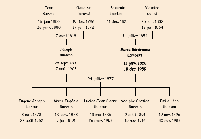 | Epouse : Marie Généreuse Lambert (21 ans, née le 14 janvier 1856, des Lamberts, cultivatrice, a signé), fille de Saturnin (cultivateur, a signé) et de Victoire Collet (décédée le 13 juillet1864) |