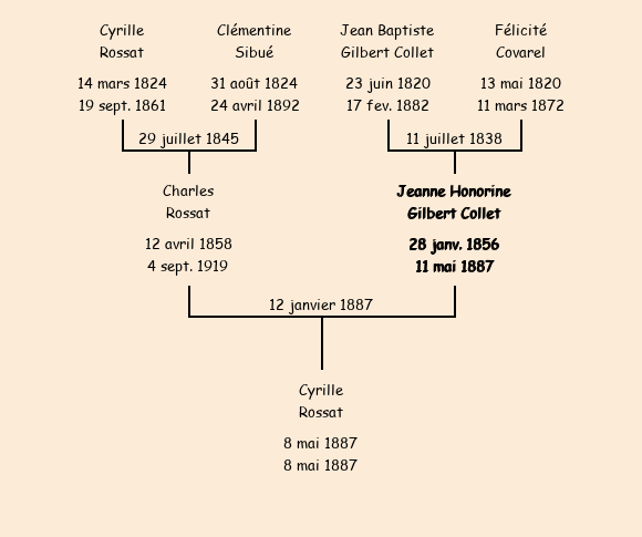 Epouse : Jeanne Honorine Gilbert Collet (30 ans, née le 28 janvier 1856, cultivatrice, a signé), fille de Jean Baptiste (décédé le 18 février1882) et de Félicité Covarel (décédée le 11 mars1872) |