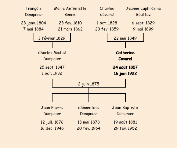 Epouse : Catherine Covarel (17 ans, née le 24 août1857, de La Rochette, cultivatrice, a signé), fille de Charles (décédé le 23 février1859 à Gênes (Italie)) et de Euphrosine Bouttaz (ménagère, n'a pas su signer) |