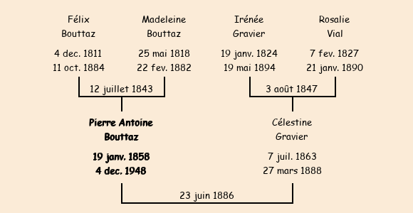 Epoux : Pierre Antoine Bouttaz (28 ans, né le 20 janvier 1858, cultivateur à Pierre Pin, a signé), fils de Félix (décédé le 11 octobre1884) et de Madeleine Bouttaz (décédée le 23 février1882) |
