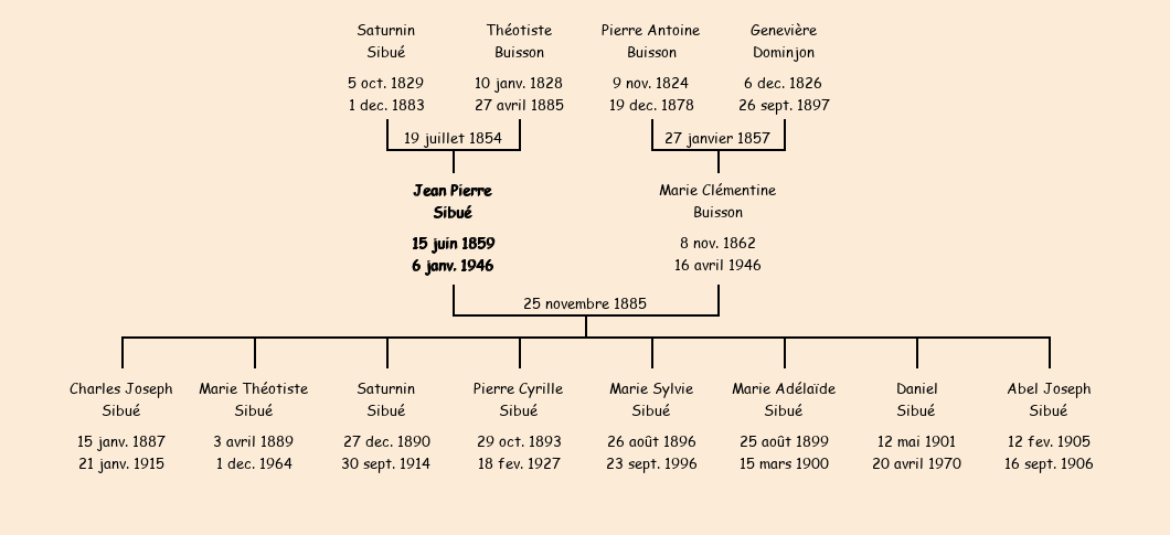Epoux : Jean Pierre Sibué (26 ans, né le 15 juin1859 à la Bize, cultivateurt à la Bize, a signé), fils de Saturnin (décédé le 2 décembre1883) et de Théotiste Buisson (décédée le 27 avril1885) |