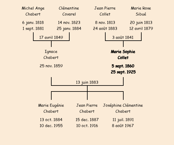 Epoux : Ignace Chabert (24 ans, né le 25 novembre1859, cultivateur aux Anselmes, a signé), fils de Michel Ange (décédé le 1er septembre1881) et de Clémentine Covarel (ménagère, n'a pas su signer) |