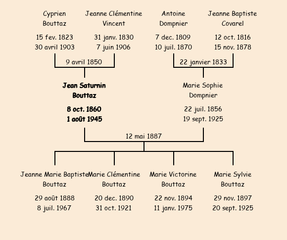Epoux : Jean Saturnin Bouttaz (27 ans, né le 8 octobre1860, cultivateur à Riortier Dessus, a signé), fils de Cyprien (cultivateur, a signé) et de Jeanne Clémentine Vincent (cultivatrice, n'a pas su signer) |