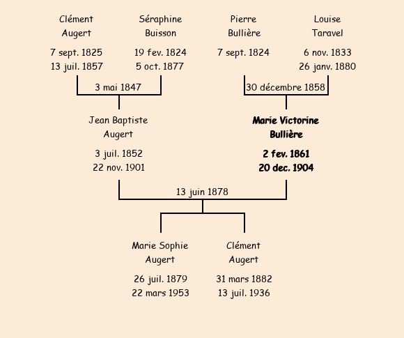 Epouse : Marie Victorine Bullière (17 ans, née le 4 février1861. (2 février), du Chef Lieu, cultivatirce, a signé), fille de Pierre (absent du pays) et de Louise Taravel (débitante de tabac au Chef Lieu, a signé) |