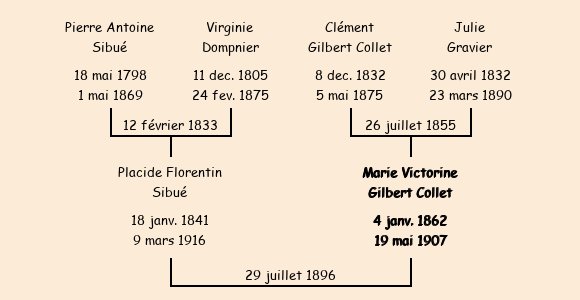 Epoux : Placide Florentin Sibué (55 ans, né le 18 janvier 1841 au Chef Lieu, cultivateur au Chef Lieu, a signé), fils de Pierre Antoine (décédé le 1er mai1869) et de Virginie Dompnier (décédée le 24 février1875) |