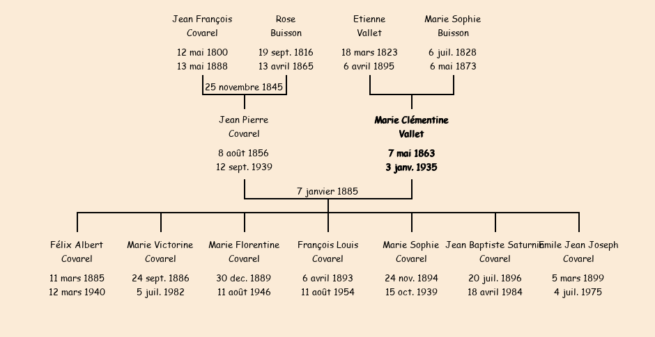 Epouse : Marie Clémentine Vallet (22 ans, née le 10 mai1863 à Jarrier (7 mai), de La Rochette, cultivatrice, a signé), fille de Etienne (mineur à Rive de Giers (Loire)) et de Sophie Buisson (décédée le 6 mai1873 à Jarrier où elle habitait ) |