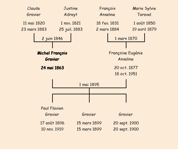 Epouse : Françoise Eugénie Anselme (18 ans, née le 20 octobre1870 à Charvin, de Charvin), fille de François (décédé le 2 mars1884) et de Marie Sylvie Taravel (décédée le 19 avril1879) |
