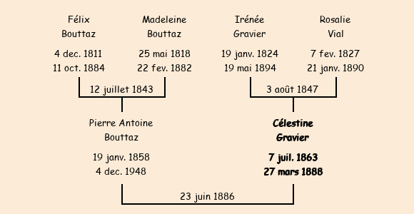 Epouse : Célestine Gravier (23 ans, née le 9 juillet1863, de La Roche Charvin, cultivatrice, a signé), fille de Irénée (cultivateur, n'a pas su signer) et de Rosalie Vial (cultivatrice, n'a pas su signer) |