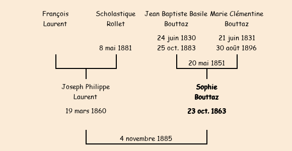 Epouse : Sophie Bouttaz (22 ans, née le 23 octobre1863, du Chef Lieu, ménagère, a signé), fille de Jean Baptiste (décédé le 25 octobre1883) et de Clémentine Bouttaz (ménagère, a signé) |