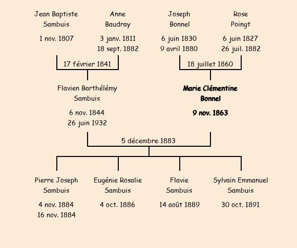 Epoux : Flavien Barthélémy Sambuis (39 ans, né le 6 novembre1844, domicilié à Albiez le Vieux, meunier, a signé), fils de Jean Baptiste (meunier à Albiez le Vieux; a signé) et de Anne Baudray (décédée le 18 septembre1883 à Albiez le Vieux) |