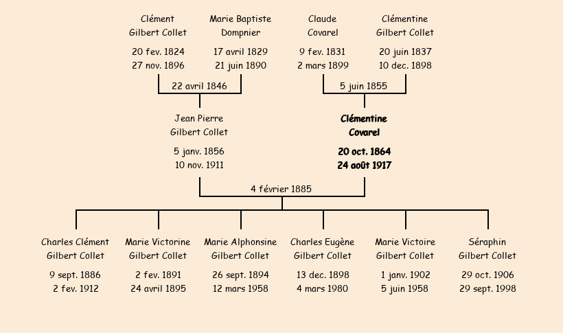 Epouse : Clémentine Covarel (20 ans, née le 20 octobre1864, de La Rochette, cultivatrice, a signé), fille de Claude (cultivateur, a signé) et de Clémentine Gilbert Collet (cultivatrice, n'a pas su signer) |