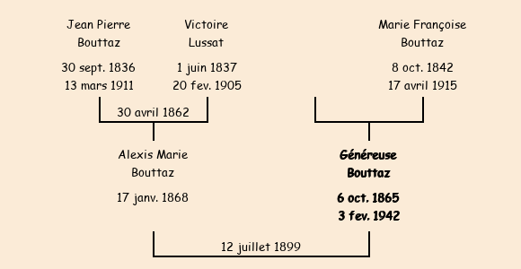 Epouse : Généreuse Bouttaz (33 ans, née à Pierre Pin le 6 octobre1865, domestique à Saint Jean, a signé), fille de Marie Françoise Bouttaz (n'a pas su signer) |