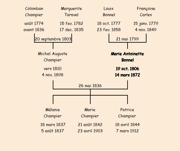 Epoux : Michel Auguste Champier, fils de feu Colomban et de feue Marguerite Taravel |