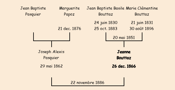 Epouse : Jeanne Bouttaz (20 ans, née le 27 décembre1866, du Chef Lieu, ménagère, a signé), fille de Jean Baptiste (décédé le 25 octobre1883) et de Clémentine Bouttaz (ménagère, n'a pas su signer) |
