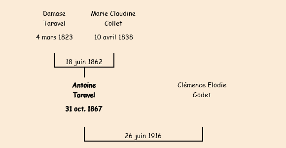 Père : Damase Taravel, fils de Jacques (laboureur, 45 ans, a signé) | Parrain : Antoine Collet |