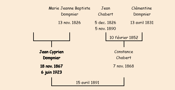 Epouse : Constance Chabert (22 ans, née le 7 novembre1868, des Anselmes, cultivatrice, a signé), fille de Jean (décédé le 5 novembre1890) et de Clémentine Dompnier (cultivatrice, n'a pas su signer) |