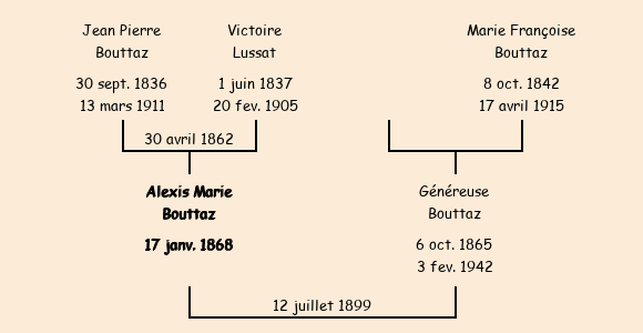 Epouse : Généreuse Bouttaz (33 ans, née à Pierre Pin le 6 octobre1865, domestique à Saint Jean, a signé), fille de Marie Françoise Bouttaz (n'a pas su signer) |