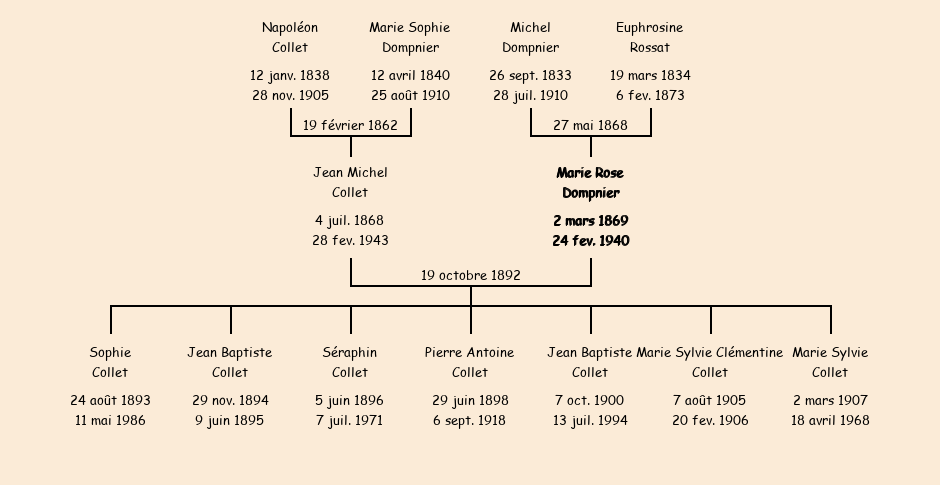 Epouse : Marie Rose Dompnier (23 ans, née le 2 mars1869, du Chef Lieu, cultivatrice, a signé), fille de Michel (cultivateur aux Anselmes, a signé) et de Euphrosine Rossat (décédée le 6 février1873) |