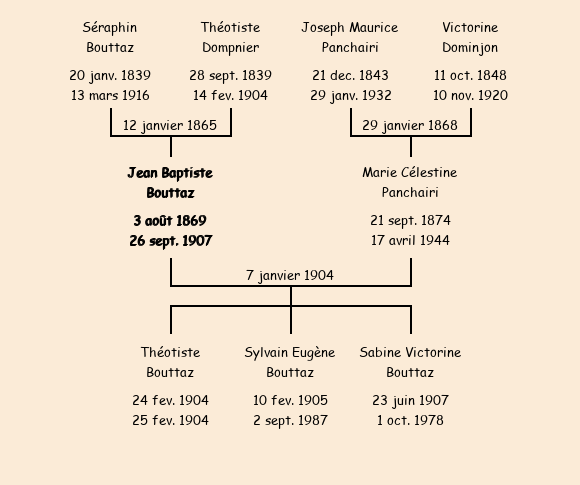 Epoux : Jean Baptiste Bouttaz (34 ans, né le 3 août1869 à la Bise), fils de Séraphin (domicilié à La Bise) et de Théotiste Dompnier (domiciliée à La Bise) |