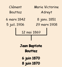Père : Clément Bouttaz, fils de Jean Pierre | Parrain : Séraphin Bouttaz |