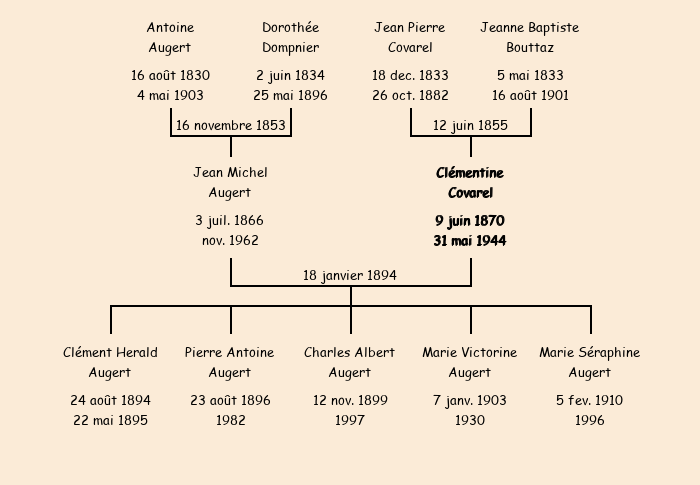 Témoins : François Augert fils d'Antoine 29 ans frère de l'époux, Clément Emmanuel Dompnier fils d'Antoine décédé, 41 ans beau frère de l'époux, Joseph Albert Coche fils de Jean Baptiste décédé, 38 ans beau frère de l'épouse, Jean Pierre Covarel fils de Charles décédé, 41 ans cousin de l'épouse |