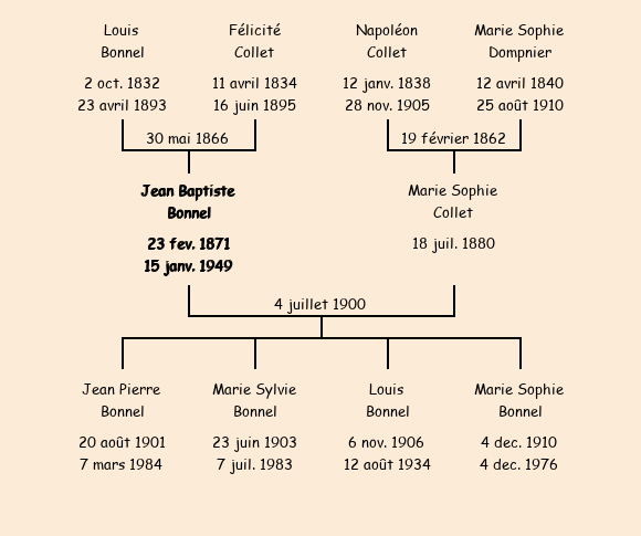 Epouse : Marie Sophie Collet (20 ans, née le 18 juillet1880, des Anselmes, cultivatrice, a signé), fille de Napoléon (cultivateur aux Anselmes, a signé) et de Marie Sophie Dompnier (cultivatrice, n'a pas su signer) |