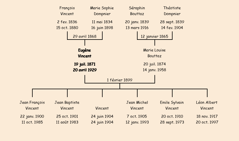 Epoux : Eugène Vincent (27 ans, né le 19 juillet1871 en Bullière, cultivateur en Bullière, a signé), fils de François (décédé en Bullière le 15 octobre1880) et de Marie Sophie Dompnier (décédée en Bullière le 16 juin1898) |