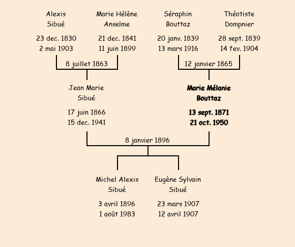Epouse : Marie Mélanie Bouttaz (24 ans, née le 13 septembre1871, de La Bise, cultivatrice, a signé), fille de Séraphin (cultivateur à La Bise, a signé) et de Théotiste Dompnier (cultivatrice, a signé) |