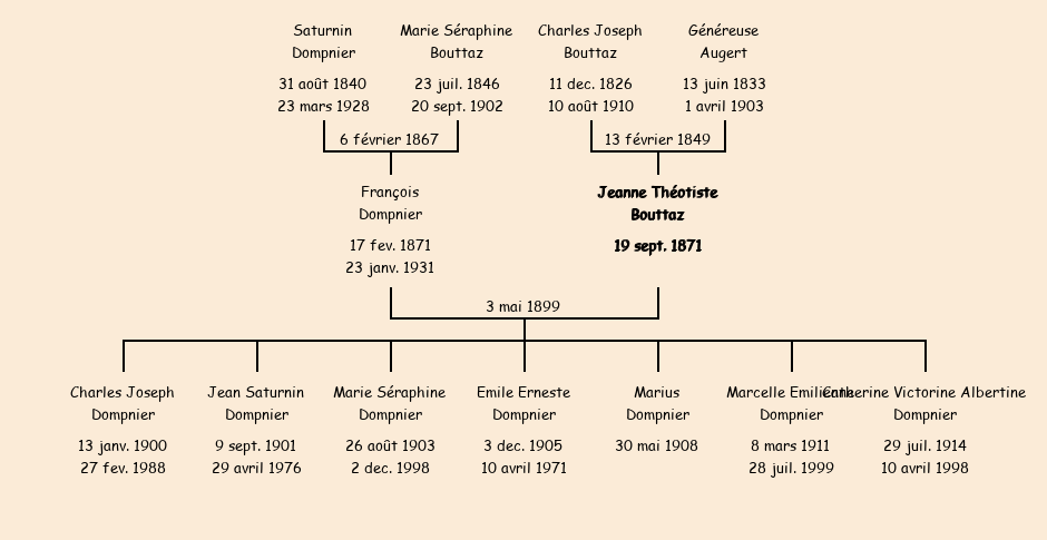 | Epouse : Théotiste Bouttaz (28 ans, née le 19 septembre1871, du Chef Lieu, cultivatrice, a signé), fille de Charles (cultivateur au Chef Lieu, a signé) et de Généreuse Augert (cultivatrice, n'a pas su signer) |