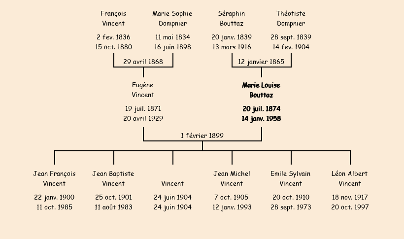 Epoux : Eugène Vincent (27 ans, né le 19 juillet1871 en Bullière, cultivateur en Bullière, a signé), fils de François (décédé en Bullière le 15 octobre1880) et de Marie Sophie Dompnier (décédée en Bullière le 16 juin1898) |