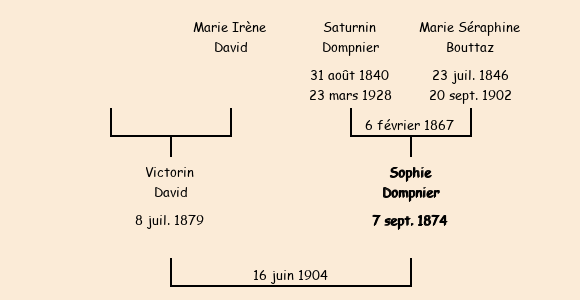 Epoux : Victorin David (25 ans, né à Montgilbert (Savoie) le 8 juillet1879, négociant boulanger à Aiguebelle), fils de Marie Irène David (ménagère à Aiguebelle) |