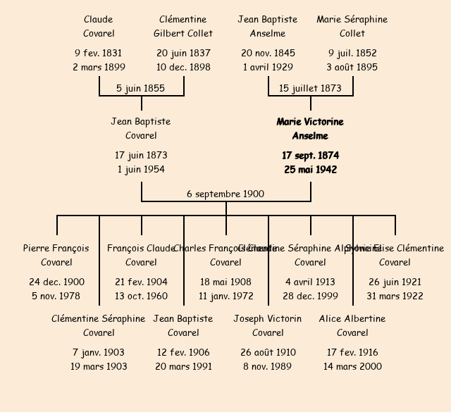 Epouse : Marie Victorine Anselme (26 ans, née le 17 septembre1874, cultivatrice, a signé), fille de Jean Baptiste (cultivateur, a signé) et de Marie Séraphine Collet (décédée le 3 août1895) |