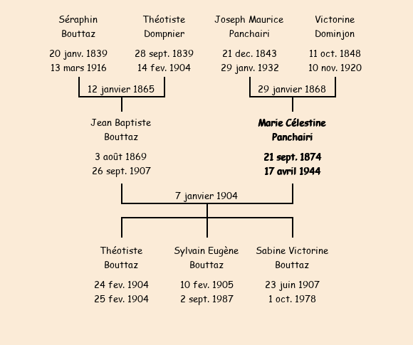 Epouse : Marie Célestine Panchairi (29 ans, née le 21 septembre1874 à la Bise), fille de Maurice (domicilié à La Bise) et de Victorine Dominjon (domiciliée à La Bise) |