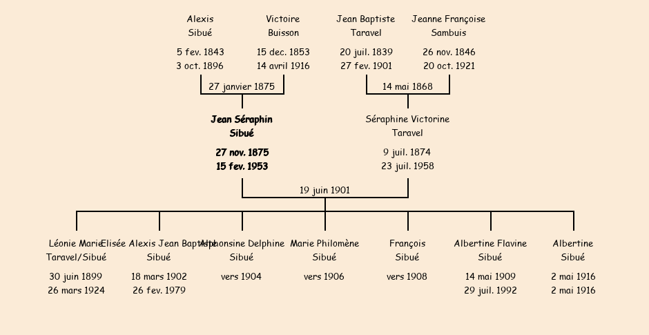 Epoux : Jean Séraphin Sibué (25 ans, né le 27 novembre1875 à la Bise), fils de Alexis (décédé à la Bise le 3 octobre1896) et de Victoire Buisson |